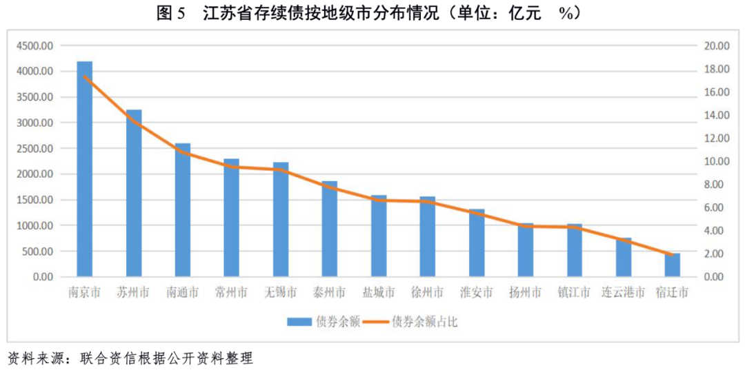 截至2021年9月底,江蘇省存續(xù)城投債24236.40億元,居全國(guó)首位。從地級(jí)市分布看,蘇南地區(qū)存續(xù)城投債合計(jì)占全省的53.67%,其中南京市存續(xù)城投債規(guī)模最大,超過(guò)4000億元,其次為蘇州市,超過(guò)3000億元;蘇北地區(qū)的宿遷市和連云港市存續(xù)債規(guī)模低于1000億元,合計(jì)占全省5%,宿遷市存續(xù)規(guī)模最小,低于500億元;其余地市城投債存續(xù)規(guī)模分布于1000~3000億元。