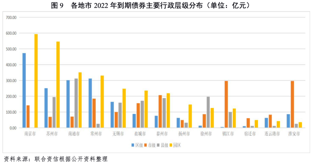江蘇省未來(lái)三年內(nèi)債券到期分布較均勻,其中2022年到期債券對(duì)應(yīng)的城投企業(yè)行政級(jí)別以區(qū)縣及園區(qū)級(jí)為主,主體級(jí)別以AA+為主;南京市、南通市及蘇州市債券到期規(guī)模較大,宿遷市、徐州市和揚(yáng)州市AA級(jí)城投企業(yè)存續(xù)債到期規(guī)模占其債券總額比重較高。鎮(zhèn)江市、淮安市和泰州市城投企業(yè)2022年到期債券的償還能力偏弱,地方政府財(cái)力對(duì)“發(fā)債城投企業(yè)全部債務(wù)+地方政府債務(wù)”覆蓋程度相對(duì)較低。