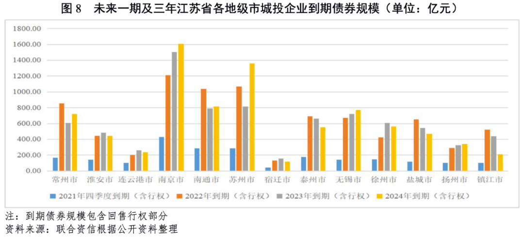 從債券到期情況看,2022-2024年,江蘇省城投企業(yè)存續(xù)債到期規(guī)模分別為8201.97億元、7923.70億元、和8217.49億元,到期分布較均勻。分區(qū)域看,南京市、無(wú)錫市和蘇州市的城投企業(yè)到期債券集中于2024年,其余地市集中于2022年和2023年。2022年,存續(xù)債到期規(guī)模較高的地級(jí)市為南京市、南通市和蘇州市,分別為1209.71億元、1036.73億元和1069.10億元,宿遷市和連云港市到期規(guī)模相對(duì)較小,分別為131.77億元和200.60億元。
