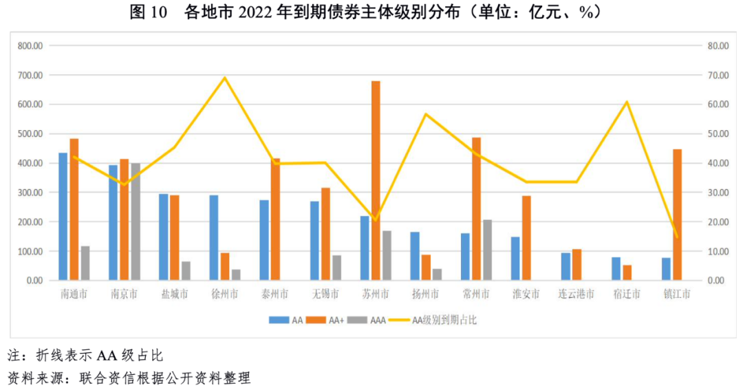 從2022年到期城投債級(jí)別看,江蘇省2022年存續(xù)債到期城投企業(yè)主體級(jí)別以高等級(jí)為主。從各地市看,蘇州、常州、鎮(zhèn)江、淮安及泰州市AA+級(jí)城投企業(yè)到期債券規(guī)模占比突出;南京市和南通市AA級(jí)城投企業(yè)到期債券規(guī)模較大,分別為393.37億元和435.27億元,占各自2022年債券到期債券總規(guī)模的比重分別為32.52%和41.98%;宿遷市、徐州市和揚(yáng)州市AA級(jí)城投企業(yè)到期債券規(guī)模分別占當(dāng)?shù)氐狡诳傄?guī)模的60.69%、68.90%和56.53%,低級(jí)別平臺(tái)到期債券規(guī)模占比較高;南京市AAA級(jí)城投企業(yè)債券到期規(guī)模398.28億元,占其2022年債券到期總額33.03%。