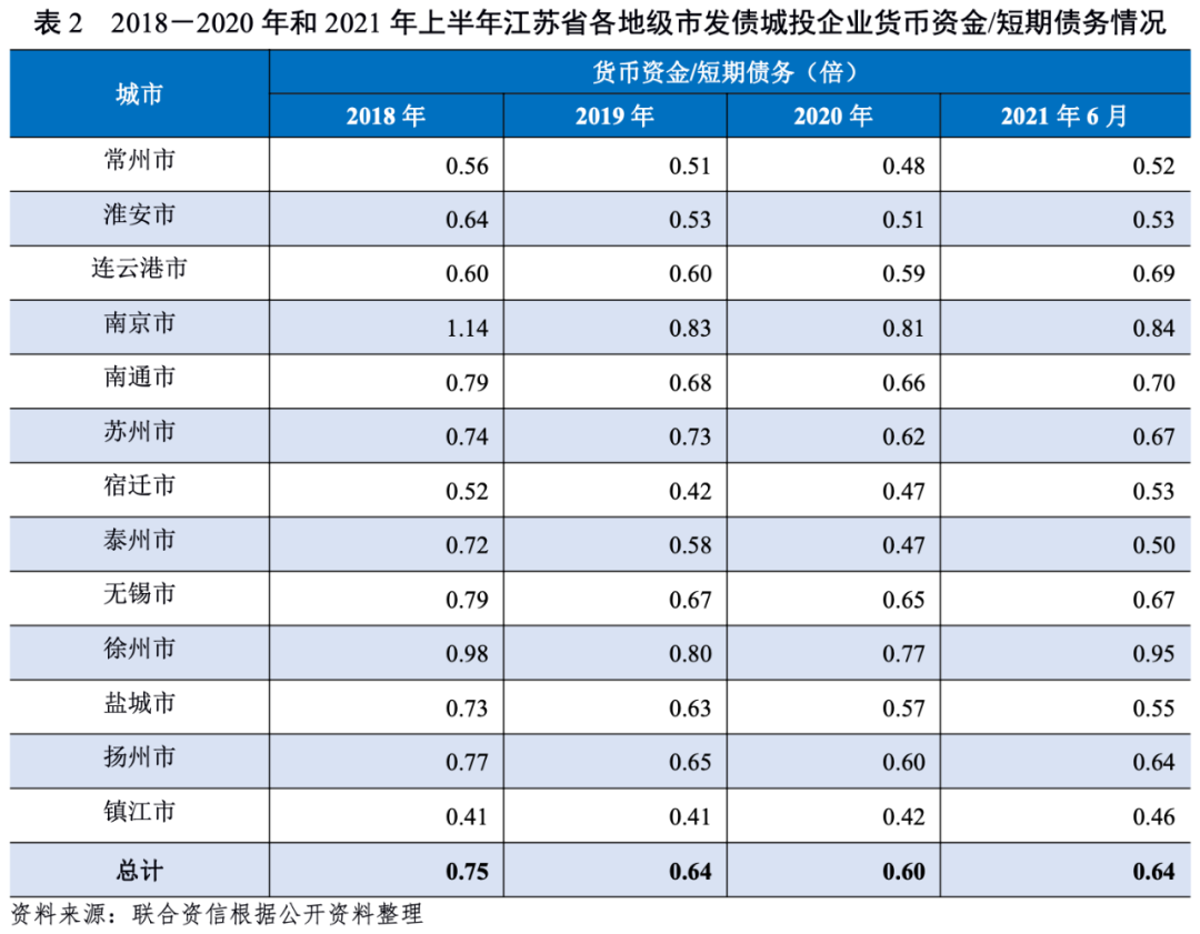 從區(qū)縣級(jí)發(fā)債城投企業(yè)貨幣資金對(duì)短期債務(wù)的覆蓋方面,截至2020年底,南京市、無(wú)錫市和南通市區(qū)縣級(jí)發(fā)債城投企業(yè)貨幣資金/短期債務(wù)倍數(shù)高于整體水平,無(wú)錫市最高,為0.80倍,短期償債能力較強(qiáng);其余地市區(qū)縣級(jí)城投企業(yè)貨幣資金/短期債務(wù)倍數(shù)低于或等于總體水平,泰州、蘇州、連云港、鹽城、徐州、鎮(zhèn)江、淮安和宿遷市區(qū)縣級(jí)發(fā)債城投企業(yè)貨幣資金/短期債務(wù)倍數(shù)在0.50~0.64倍之間;常州市區(qū)縣級(jí)發(fā)債城投企業(yè)貨幣資金/短期債務(wù)倍數(shù)最低,為0.49倍,短期償債能力相對(duì)較弱。2021年6月底,江蘇省區(qū)縣級(jí)發(fā)債城投企業(yè)貨幣資金/短期債務(wù)倍數(shù)較2020年底整體有所上升,無(wú)錫市及鹽城市略有下降。