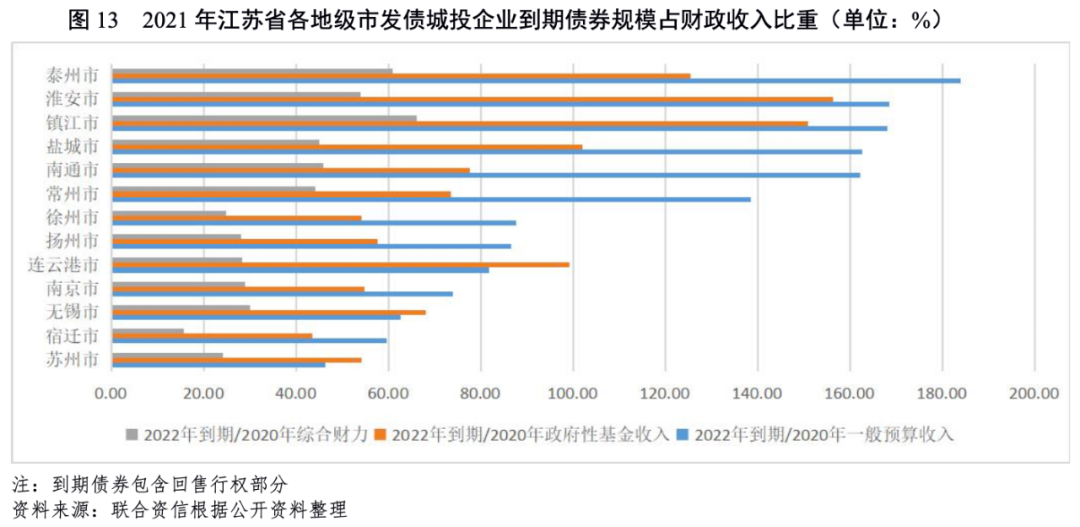 我們以城投企業(yè)2022年到期債券規(guī)模占一般公共預(yù)算收入或政府性基金收入的比重來(lái)衡量一般公共預(yù)算收入或政府性基金收入對(duì)到期債券的覆蓋情況,償債能力偏弱的城市為泰州市、淮安市和鎮(zhèn)江市;以城投企業(yè)2022年到期債券占2020年地方政府綜合財(cái)力的比重來(lái)近似衡量2022年城投債券的到期償還能力,泰州市、鎮(zhèn)江市和淮安市城投企業(yè)2022年到期債券占地方政府綜合財(cái)力的占比分別為60.86%、66.17%和53.92%。總體看,泰州市、鎮(zhèn)江市和淮安市城投企業(yè)2022年到期債券的償還能力偏弱。