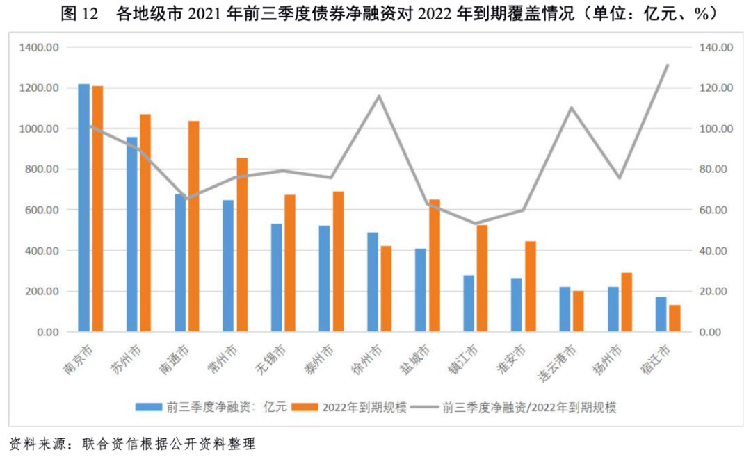 從2021年前三季度債券凈融資對(duì)2022年到期債券覆蓋程度來(lái)看,江蘇省2022年按行權(quán)統(tǒng)計(jì)到期債券規(guī)模合計(jì)8201.97億元,2021年前三季度發(fā)行規(guī)模為其80.66%,覆蓋情況較好。同期,各地市中覆蓋程度位居前三的為宿遷市、徐州市和連云港市,分別為130.99%、115.69%和110.00%;鎮(zhèn)江市、淮安市和鹽城市覆蓋程度較低,分別為53.15%、59.72和62.77%。