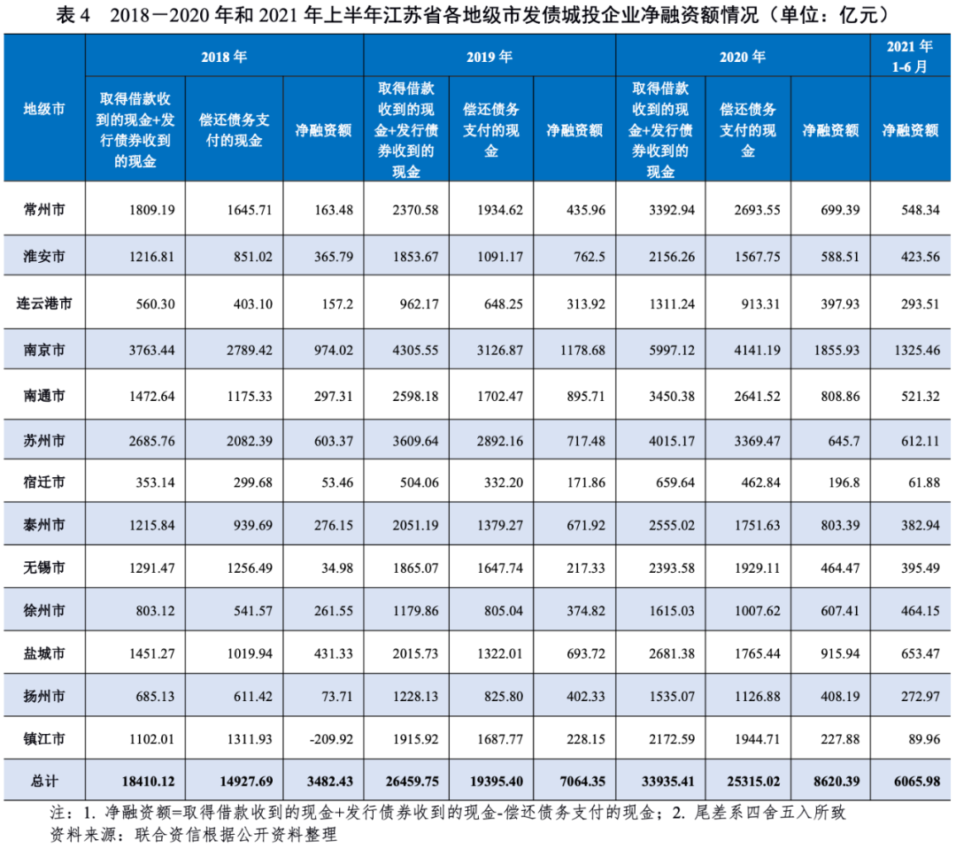 2021年1-6月,江蘇省凈融資情況較好,全省總計(jì)凈融資額6065.98億元,相當(dāng)于2020年70.37%。分地級(jí)市來(lái)看,宿遷市和鎮(zhèn)江市凈融資額偏低,分別相當(dāng)于2020年凈融資額31.44%和39.48%;常州市、蘇州市、無(wú)錫市和徐州市凈融資情況較好,分別相當(dāng)于2020年凈融資額78.40%、94.80%、85.15%和76.42%。