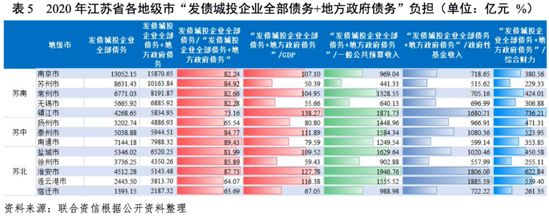 從發(fā)債城投企業(yè)全部債務(wù)與“發(fā)債城投企業(yè)全部債務(wù)+地方政府債務(wù)”的比值看,截至2020年底,除連云港市、揚(yáng)州市和宿遷市外,其他地級(jí)市發(fā)債城投企業(yè)全部債務(wù)占“發(fā)債城投企業(yè)全部債務(wù)+地方政府債務(wù)”的比重均超過(guò)70%,整體處于較高水平。