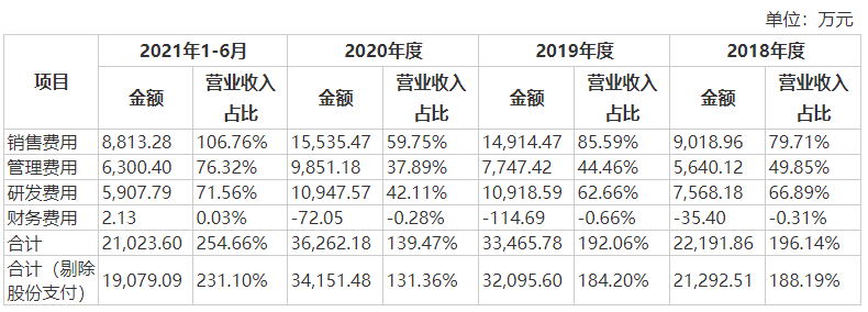 根據(jù)招股書(shū),報(bào)告期星環(huán)科技的期間費(fèi)用率(剔除股份支付)分別為188.19%、184.2%、131.36%及231.1%,即期間費(fèi)用均超過(guò)了營(yíng)業(yè)收入,導(dǎo)致虧損。由于營(yíng)業(yè)收入具有季節(jié)性,集中在下半年,從而2021年上半年的期間費(fèi)用率畸高,這里不做討論。