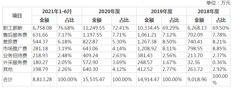 從銷售費(fèi)用構(gòu)成來(lái)看,市場(chǎng)推廣費(fèi)用占比逐期下降,至2021年上半年僅為3.19%,而銷售人員薪酬和售后服務(wù)費(fèi)成為占比最高的兩項(xiàng),兩者在2020年及2021年上半年合計(jì)占比8成以上。