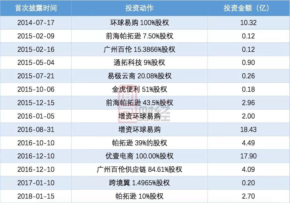 轉型電商之后,跨境通就開啟了“買買買”的連續(xù)并購模式,以下為根據(jù)公開信息整理的公司并購擴張歷程: