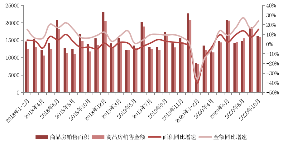 國(guó)家統(tǒng)計(jì)局?jǐn)?shù)據(jù)顯示:2020年10月全國(guó)商品房銷(xiāo)售面積16221萬(wàn)平方米,環(huán)比下降13%,銷(xiāo)售金額16018億元,環(huán)比下降14%。同比來(lái)看,2020年10月銷(xiāo)售面積與金額分別比2019年10月增加15%和24%,今年的“銀十”發(fā)力明顯。