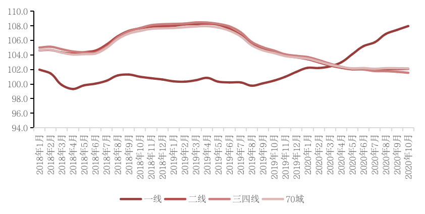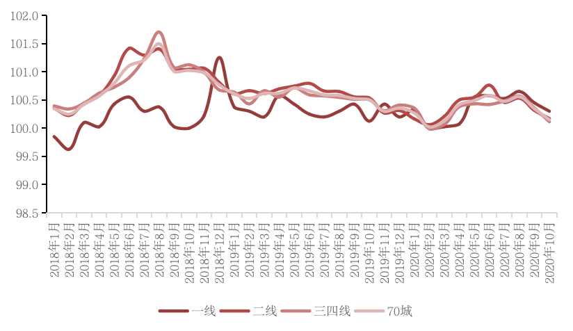 從全國(guó)70個(gè)大中城市商品住宅銷(xiāo)售價(jià)格來(lái)看,10月除一線(xiàn)城市同比漲幅繼續(xù)擴(kuò)大外,其余二三線(xiàn)城市新房及二手房房?jī)r(jià)均同、環(huán)比漲幅收窄。具體來(lái)看,10月份,4個(gè)一線(xiàn)城市新建商品住宅銷(xiāo)售價(jià)格環(huán)比上漲0.3%,漲幅比上月回落0.1個(gè)百分點(diǎn)。其中,北京、上海、廣州和深圳分別上漲0.2%、0.3%、0.5%和0.2%。