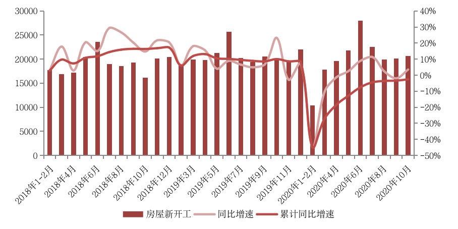 受中央融資“三條紅線(xiàn)”限制,房企迫切需要資金節(jié)流,但由于每年九、十兩月為傳統(tǒng)推盤(pán)旺季,再加上即將到來(lái)的年底銷(xiāo)售節(jié)點(diǎn),項(xiàng)目新開(kāi)工與加大建安投資也成為了各大房企的必然決策,因此10月房屋新開(kāi)工面積同比單月由負(fù)轉(zhuǎn)正。