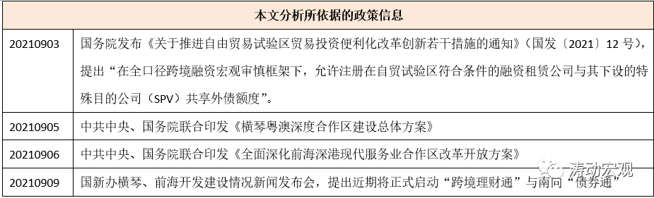 2021年9月5日與6日發(fā)布的兩個(gè)《方案》明確了兩大合作區(qū)未來(lái)15年(兩個(gè)方案均展望至2035年)的發(fā)展目標(biāo)與舉措,里面提出的一系列支持政策預(yù)計(jì)后續(xù)還會(huì)有相關(guān)配套細(xì)則出臺(tái),如9月9日央行副行長(zhǎng)潘功勝便透露“央行正牽頭港澳金融管理部門(mén)制定金融支持兩地改革開(kāi)放的專門(mén)文件”。同時(shí)考慮到廣州南沙新區(qū)、深圳前海蛇口以及珠海橫琴新區(qū)均屬于廣東自貿(mào)區(qū),因此這里將《關(guān)于推進(jìn)自由貿(mào)易試驗(yàn)區(qū)貿(mào)易投資便利化改革創(chuàng)新若干措施的通知》納入進(jìn)來(lái)。