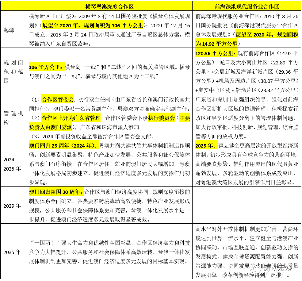 但有它們之間一些差異,主要體現(xiàn)在橫琴粵澳深度合作區(qū)的行政層級(jí)明顯提升(名義上升為廣東省管理、實(shí)際上澳門(mén)方面的權(quán)限更大),即橫澳合作區(qū)可以被看作是澳門(mén)島的擴(kuò)容、實(shí)際上是以澳門(mén)為主在管理;深港合作區(qū)則是原前海合作區(qū)的擴(kuò)容,主要為原前海合作區(qū)相關(guān)政策的平移、仍延續(xù)現(xiàn)行管理模式。