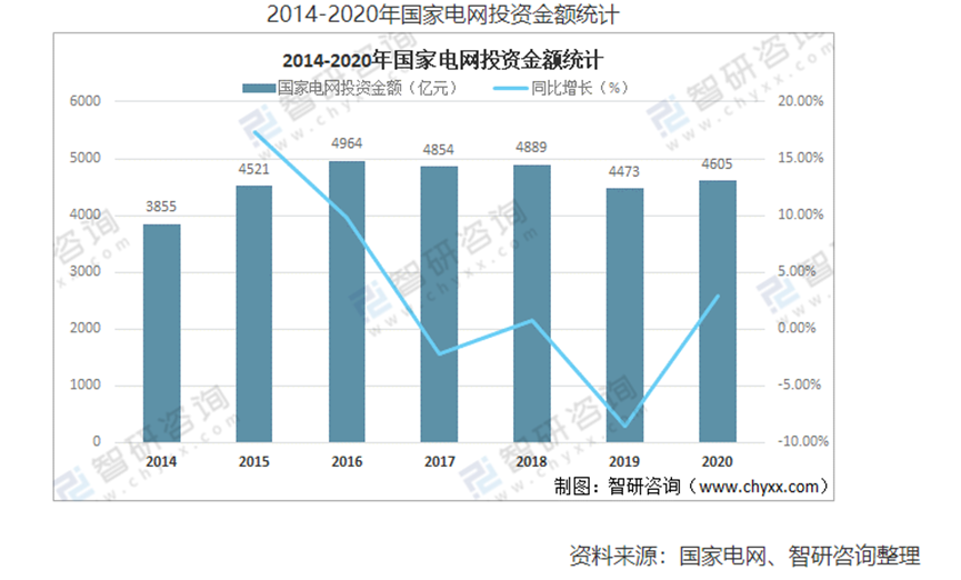 與此同時,新能源發(fā)電高速發(fā)展,風(fēng)電裝機容量約3.3億千瓦,同比增長16.6%;太陽能發(fā)電裝機容量約3.1億千瓦,同比增長20.9%。用電需求的增加疊加新能源發(fā)電建設(shè)使得我國電網(wǎng)投資重歸增長態(tài)勢。2020年國家電網(wǎng)投資金額達4605億元,較2019年增加了132億元,同比增長2.95%,2021年國網(wǎng)計劃投資4730億元。據(jù)中國能源報報道,2022年電網(wǎng)投資額規(guī)劃為5012億,同比增長6%,創(chuàng)造歷史新高。