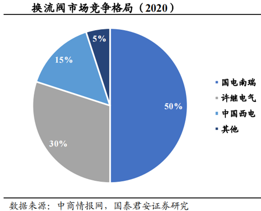 柔性直流輸電在實現(xiàn)區(qū)域聯(lián)網(wǎng)提高供電可靠性、緩解負荷密集地區(qū)電網(wǎng)運行壓力等更多領(lǐng)域得到應(yīng)用,是改變大電網(wǎng)發(fā)展格局的戰(zhàn)略選擇。相比傳統(tǒng)特高壓輸電項目,IGBT換流閥和極線斷路器投資占比更高,投資占比接近20%。2007年以前,世界范圍內(nèi)實現(xiàn)柔性直流換流閥工程應(yīng)用的只有ABB公司,且采用的是兩電平/三電平技術(shù)路線,存在運行損耗高、容量擴展難等問題。2007年年底,國家電網(wǎng)公司決定建設(shè)上海南匯風(fēng)電場柔性直流輸電工程。2013~2021年,柔性直流換流閥參數(shù)不斷提升,新技術(shù)不斷涌現(xiàn),工程應(yīng)用形式從兩端到多端再到組成直流電網(wǎng),實現(xiàn)了從科技示范到大規(guī)模應(yīng)用的飛躍。由于柔性直流輸電的低慣性特點,故障發(fā)展速度極快,所以需要斷路器超高速的保護與之配合,作用十分關(guān)鍵。極線斷路器成本占比也達10.9%,占比甚至高于換流變壓器。從2020年的換流閥市場競爭格局來看,國電南瑞占據(jù)半壁江山,其次是許繼電氣和中國西電。從工程中標情況看,柔直換流閥環(huán)節(jié)仍以國電南瑞、許繼集團、四方電工、特變電工、中國西電等主要電網(wǎng)設(shè)備公司參與為主。極線斷路器方面,國電南瑞、思源電氣、許繼電氣等保持領(lǐng)先。