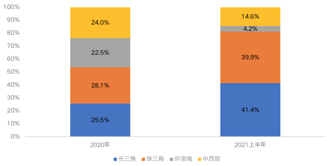 圖:萬(wàn)科2020年及2021年上半年各區(qū)投資占比情況(剔除22城)