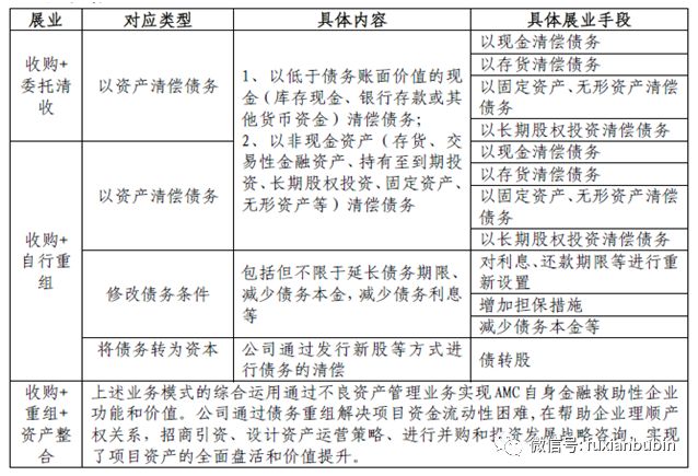 根據(jù)《企業(yè)會計準則第12號——債務(wù)重組》(第三條)相關(guān)規(guī)定,債務(wù)重組主要包括“以資產(chǎn)清償債務(wù)、將債務(wù)轉(zhuǎn)為資本,修改其他債務(wù)條件(包括但不限于延長債務(wù)償還期限、延長債務(wù)償還期限并加收利息、延長債務(wù)償還期限并減少債務(wù)本金或債務(wù)利息),或以上手段的綜合使用”。其與不良資產(chǎn)經(jīng)營市場主體的債務(wù)重組業(yè)務(wù)可做如下對應(yīng):