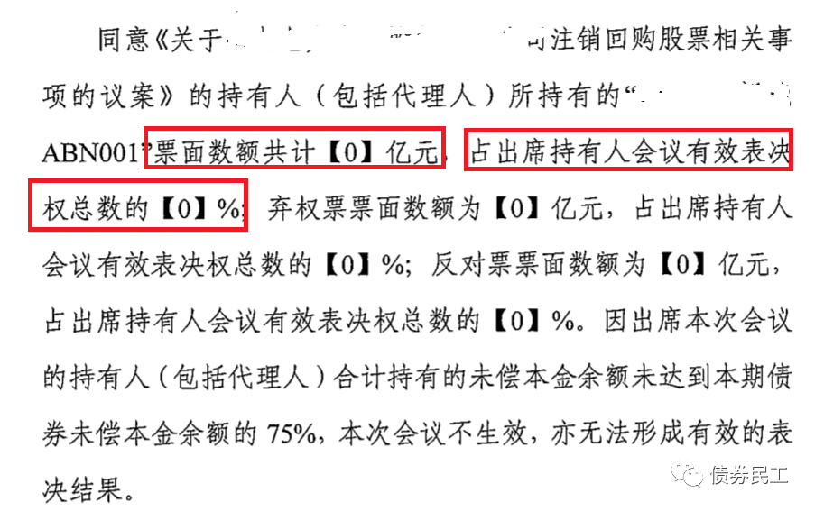 當然,這并不是第一個債券持有人零參與的持有人會議。之前披露的公告中,某個ABN參會債券持有人持有債券金額占存續(xù)債券總額的0%,也是持有人另參與。