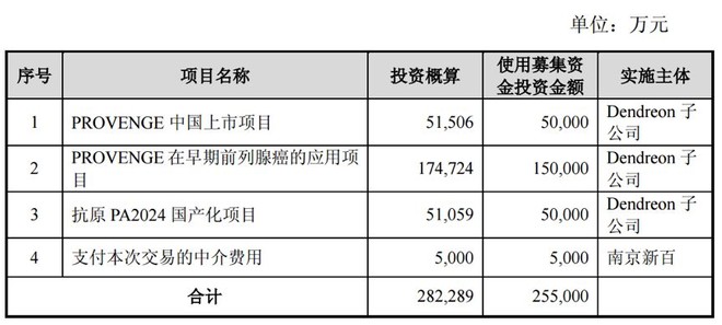 根據(jù)南京新百的收購(gòu)方案,公司擬配套募資25.5億元用于Provenge在中國(guó)上市項(xiàng)目、Provenge在早期前列腺癌的應(yīng)用項(xiàng)目、抗原PA2024國(guó)產(chǎn)化項(xiàng)目的建設(shè)運(yùn)營(yíng)等。