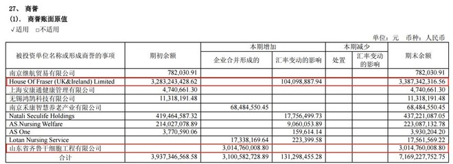 一個(gè)是2014年收購(gòu)英國(guó)百貨公司HOF產(chǎn)生的商譽(yù),加上后來(lái)匯率波動(dòng)的影響截止2017年底,這部分的商譽(yù)余額是33.87億元。一個(gè)是2017年并表齊魯干細(xì)胞新增商譽(yù)約30.15億元。以下為公司2017年年報(bào)中披露的商譽(yù)明細(xì)情況: