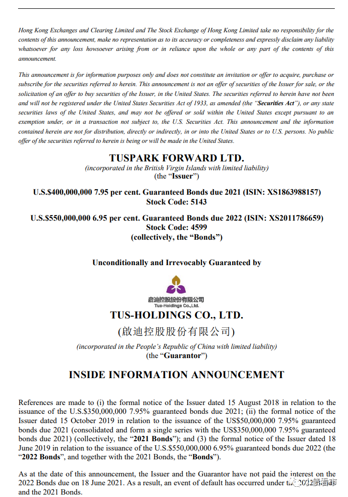7月8日,啟迪控股股份有限公司(以下簡稱“啟迪控股”)公告稱,由于發(fā)行人及擔(dān)保人截至公告日尚未支付于2021年6月18日到期的THSCPA 6.95 06/18/22債券利息,其2022年和2021年美元債發(fā)生違約事件。