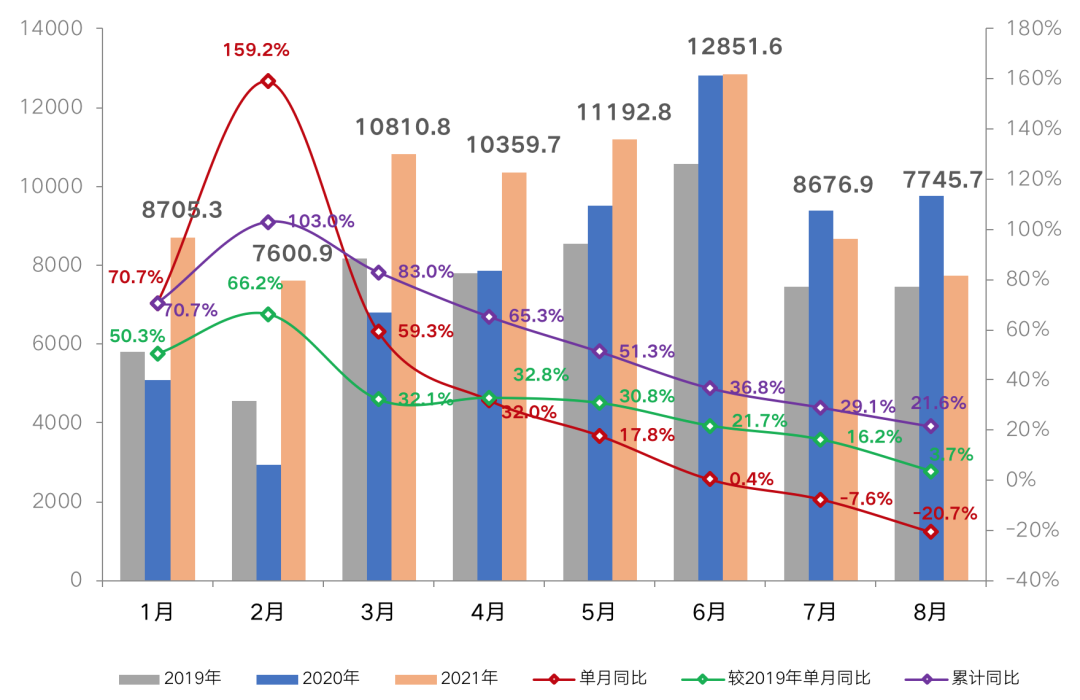 百?gòu)?qiáng)房企業(yè)績(jī)表現(xiàn)也不盡如人意,8月百?gòu)?qiáng)房企銷(xiāo)售操盤(pán)金額7745.7億元,同比下降20.7%、環(huán)比下降10.7%。繼7月業(yè)績(jī)同比首次出現(xiàn)下跌之后,再度下跌超兩成。
