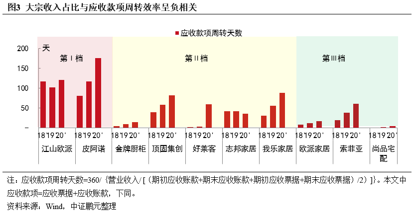 本次房企風(fēng)險暴露,通過大宗業(yè)務(wù)傳導(dǎo),直接影響定制家居企業(yè)的收入及回款。大宗業(yè)務(wù)“量大利薄賬期長”,會拖累企業(yè)應(yīng)收款項周轉(zhuǎn)效率,導(dǎo)致其經(jīng)營現(xiàn)金流弱化,甚至引發(fā)回款風(fēng)險,已有江山歐派、皮阿諾、頂固集創(chuàng)、我樂家居等企業(yè)被曝持有的恒大商票等款項逾期;大宗業(yè)務(wù)毛利率本就低于零售渠道且呈下降趨勢,未來如轉(zhuǎn)向同優(yōu)質(zhì)房企合作,預(yù)計毛利率仍將承壓。相比之下,龍頭企業(yè)受影響較小,中部、尾部企業(yè)受波及程度大,大宗業(yè)務(wù)占比高、合作房企負(fù)債率高的企業(yè)影響更甚。