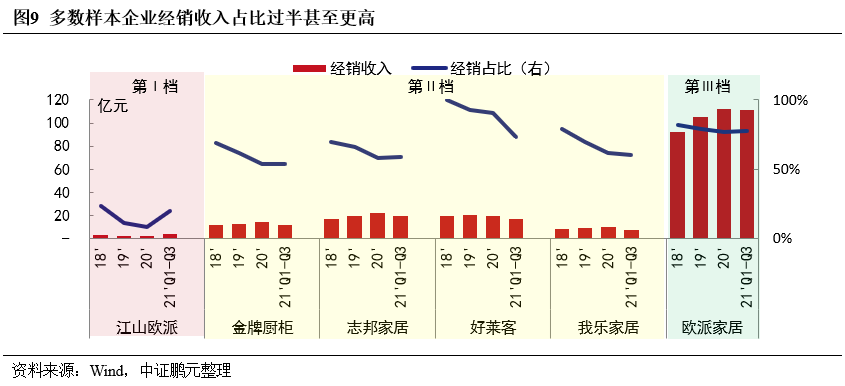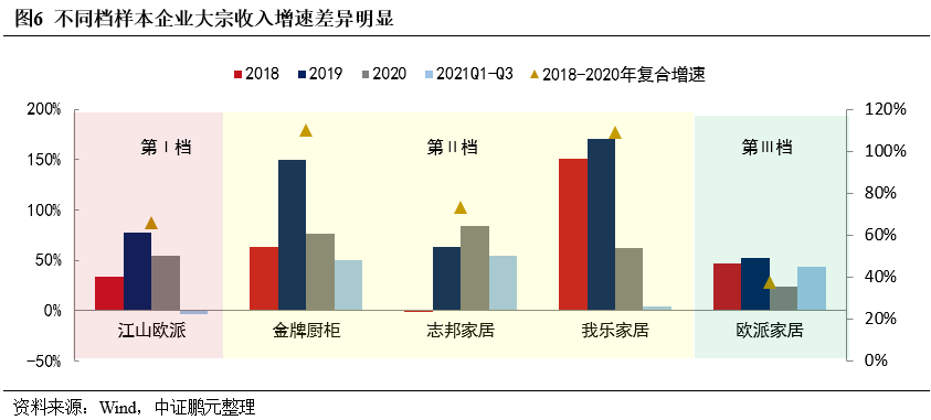 從三年復(fù)合增速看,江山歐派以大宗業(yè)務(wù)為主業(yè),其增速水平仍然不低,金牌廚柜、志邦家居、我樂家居均保持了70%以上的增速,歐派家居增速最低。從2021年前三季度大宗業(yè)務(wù)增速來看,三檔企業(yè)分化更加明顯。歐派家居仍保持增長,江山歐派已出現(xiàn)負(fù)增長,第II檔的我樂家居增速也受到重創(chuàng)。金牌廚柜和志邦家居增速受影響較小,主要是金牌廚柜的代理模式占比高,志邦家居調(diào)整客戶結(jié)構(gòu)后恒大等高負(fù)債客戶合作量大幅下降所致。