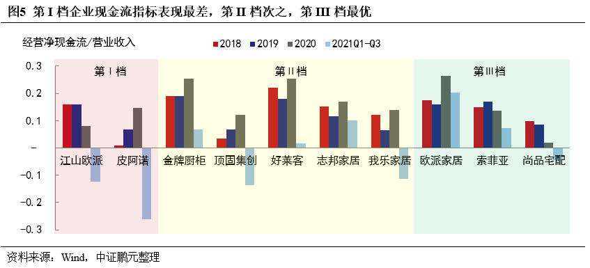 大宗業(yè)務(wù)占比高或大宗客戶風(fēng)險大的樣本企業(yè)經(jīng)營現(xiàn)金流弱化。2021年下半年以來房企流動性緊張,直接影響定制家居企業(yè)回款。江山歐派和皮阿諾經(jīng)營現(xiàn)金流指標(biāo)在2021年1-9月出現(xiàn)明顯的下滑,頂固集創(chuàng)由于積極推進(jìn)大宗業(yè)務(wù),業(yè)務(wù)合作保證金支出較大拖累經(jīng)營現(xiàn)金流,我樂家居2021年半年報顯示其應(yīng)收賬款前五大均為恒大地產(chǎn)、華夏幸福及金科地產(chǎn)的關(guān)聯(lián)企業(yè)。尚品宅配不涉及大宗業(yè)務(wù),其經(jīng)營現(xiàn)金流指標(biāo)弱化則是由于戰(zhàn)略調(diào)整,全面轉(zhuǎn)型整裝業(yè)務(wù)所致。