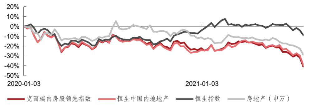 與之相對(duì)應(yīng)的是,自去年以來(lái)A股、港股地產(chǎn)股整體表現(xiàn)低迷。克而瑞證券監(jiān)測(cè)數(shù)據(jù)顯示,2020年1月1日至今,克而瑞內(nèi)房股領(lǐng)先指數(shù)跌幅40.7%,同期恒生中國(guó)內(nèi)地地產(chǎn)指數(shù)跌幅39.3%。