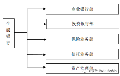 從全能銀行的組織架構(gòu)上來看,一般來說,其內(nèi)部會(huì)設(shè)置平級(jí)的金融業(yè)務(wù)部門,全面經(jīng)營(yíng)商業(yè)銀行、投資銀行、保險(xiǎn)、信托、資產(chǎn)管理等項(xiàng)業(yè)務(wù),多種業(yè)務(wù)混合、交叉經(jīng)營(yíng),并實(shí)行一級(jí)法人制。在這種模式中銀行是一種名副其實(shí)的金融百貨公司,客戶只要到銀行來,所有的金融業(yè)務(wù)都可在此辦理。商業(yè)銀行及證券承銷業(yè)務(wù)就像一家大型百貨公司內(nèi)部?jī)蓚€(gè)不同部門,其規(guī)模經(jīng)濟(jì)效應(yīng)最為明顯。