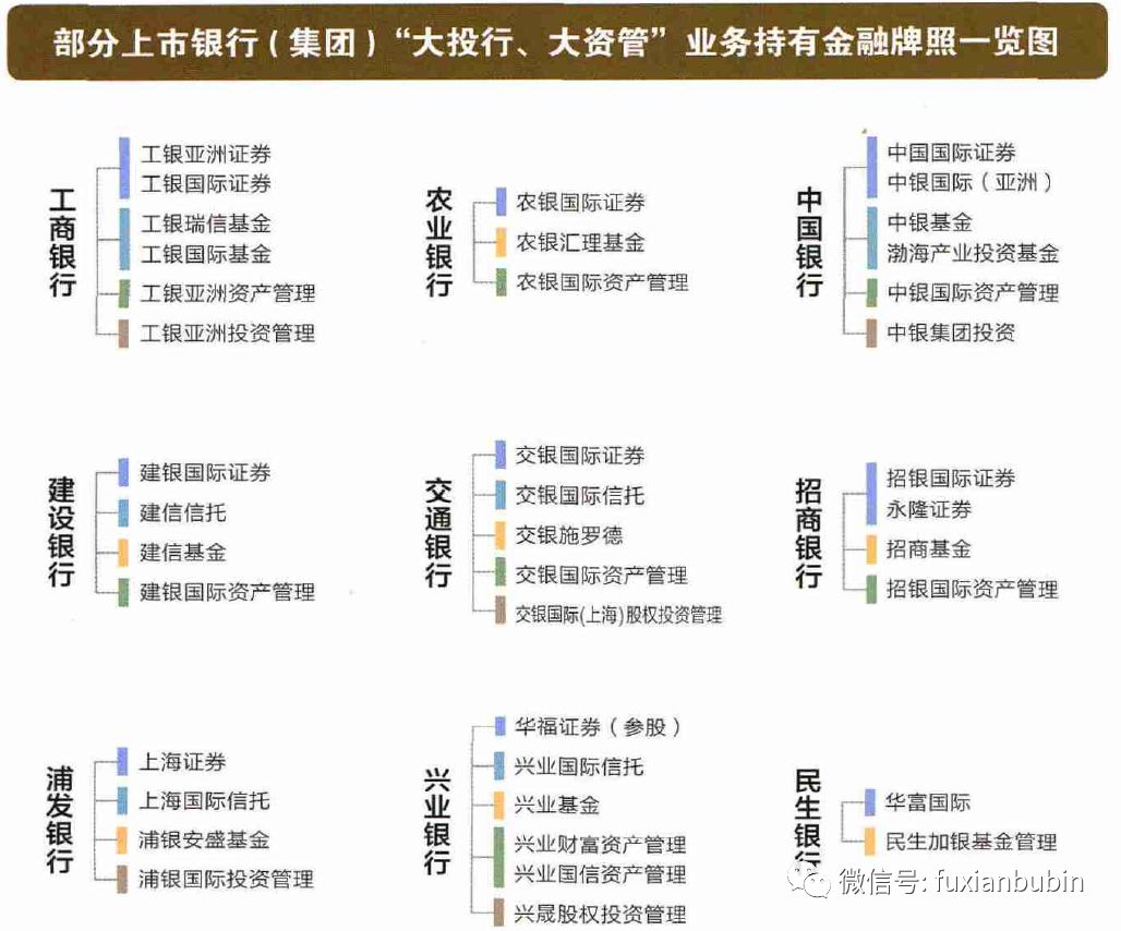 在金融市場(chǎng)化和去杠桿的大背景下,經(jīng)濟(jì)發(fā)展方式的轉(zhuǎn)變和結(jié)構(gòu)調(diào)整必然引發(fā)社會(huì)融資結(jié)構(gòu)的深刻變化,由此導(dǎo)致原先以銀行信貸資金凝結(jié)而成的經(jīng)濟(jì)結(jié)構(gòu)體系發(fā)生顛覆式調(diào)整,跨業(yè)、跨界經(jīng)營(yíng)為銀行業(yè)提供了巨大的發(fā)展空間,在既有的分業(yè)監(jiān)管、分業(yè)經(jīng)營(yíng)格局下,各家銀行在合法合規(guī)的基礎(chǔ)上,借助直接、間接控股或集團(tuán)內(nèi)關(guān)聯(lián)的方式,將券商、信托、基金、資產(chǎn)管理公司、股權(quán)投資公司的金融牌照進(jìn)行整合,開辟新的增長(zhǎng)空間,推動(dòng)銀行轉(zhuǎn)型發(fā)展,而圍繞相關(guān)業(yè)務(wù)搭建的金融集團(tuán)框架也日漸成型: