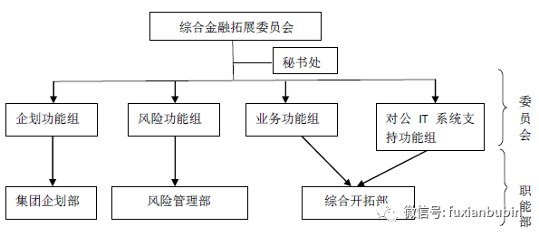 綜合金融拓展委員會(huì)是綜合金融推進(jìn)的最高決策機(jī)構(gòu),僅存在于集團(tuán)層面,并不是常設(shè)機(jī)構(gòu),作為最上層的組織建構(gòu),均是由各子公司主要負(fù)責(zé)人組成,對(duì)內(nèi)負(fù)責(zé)統(tǒng)籌集團(tuán)化運(yùn)作發(fā)展目標(biāo)的制定,督促各子公司業(yè)務(wù)的落實(shí);對(duì)外負(fù)責(zé)與監(jiān)管機(jī)構(gòu)的溝通交流,團(tuán)金會(huì)設(shè)執(zhí)行官作為最高領(lǐng)導(dǎo),通常由旗下最重要的金融機(jī)構(gòu)負(fù)責(zé)人擔(dān)任,設(shè)有秘書處負(fù)責(zé)日常工作的開展。綜合金融拓展委員會(huì)主要負(fù)責(zé)宏觀業(yè)務(wù)導(dǎo)向和發(fā)展目標(biāo)設(shè)定,具體工作職責(zé)包括擬定并實(shí)施集團(tuán)綜合金融開拓戰(zhàn)略,制定綜合開拓相關(guān)流程和政策,制定、推動(dòng)并追蹤評(píng)估綜合金融開拓計(jì)劃預(yù)算,溝通協(xié)調(diào)解決子公司間沖突、平衡渠道利益,統(tǒng)籌綜合金融開拓產(chǎn)品與整合后援支持體系,協(xié)調(diào)跨系列大項(xiàng)目并追蹤其落地執(zhí)行情況等六個(gè)方面。在具體工作機(jī)制上,綜合金融拓展委員會(huì)基本上會(huì)按月或按季召開會(huì)議,負(fù)責(zé)跟蹤年初設(shè)定目標(biāo)的落地執(zhí)行情況,并根據(jù)需要適當(dāng)調(diào)整經(jīng)營(yíng)目標(biāo)。