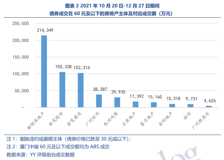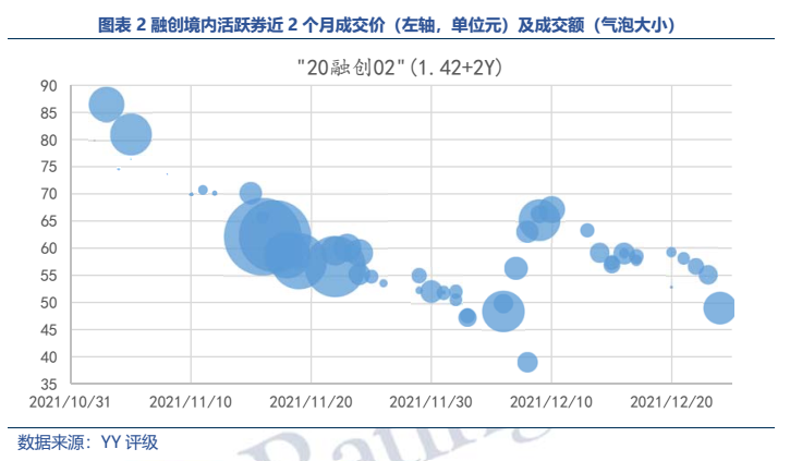 公開信息顯示融創(chuàng)2021年12月有14億元ABS+1.5億元供應鏈ABS到期,2022年一季度有35億元公司債+10億元ABS到期,此外訪談信息顯示一季度到期債務還有77億元貸款+20~30億元信托+境外融資4億元美金(有部分是質押萬達股票)。境內活躍券“20融創(chuàng)02”成交凈價自10月底來一路下跌,12月初在一行兩會表態(tài)后有一波上漲,隨后繼續(xù)下跌,目前在49元左右。