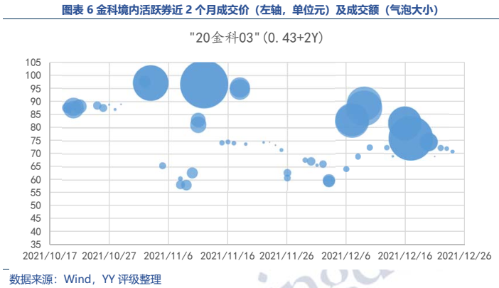 金科近兩月加強了債券投資人溝通,對于市場傳聞及負面輿情反應也較為迅速,聲稱無任何融資逾期。從活躍券“20金科03”成交來看,11月初及12月初曾一度跌至60元以下,隨后隨著金融監(jiān)管機構對房企融資釋放暖意,債券價格有所回升,目前在70元檔位。