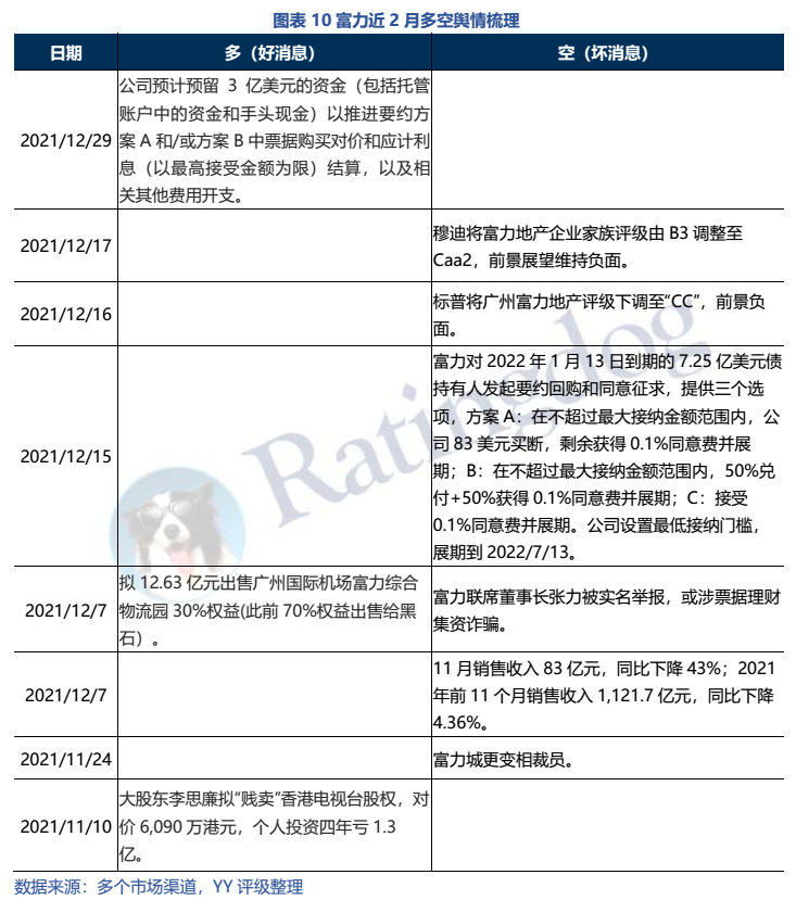 相較于今年暴露風險的民企,富力債務重壓問題盤亙已久,市場皆知,但公司仍通過銷售、資產出售和股東借款硬扛了許久,繼9月大股東將“倒賣”富力物業(yè)的收益借給公司后,12月公司以12.63億元清空了廣州物流園股權。面對行業(yè)下行及2022年1月到期的7.25億美元債,富力最終還是沒抗住,向持有人發(fā)起交換要約試圖將一部分債務展期支付。