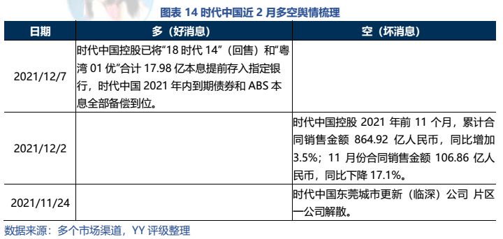 時代中國近兩個月除了還債以外,公開信息未見其他動作。時代中國短期債券到期壓力不大(2022年一季度無境內外債券到期,最臨近到期債券為4月份4.25億境外債),除了11月24日市場傳出東莞城市更新公司某一片區(qū)公司解散外,暫未出現其他負面輿情。