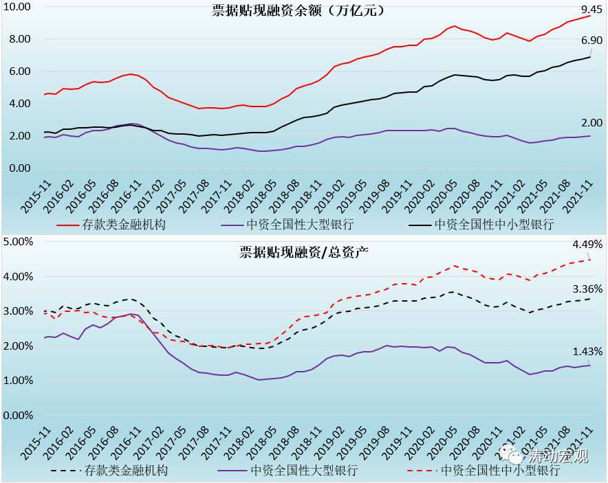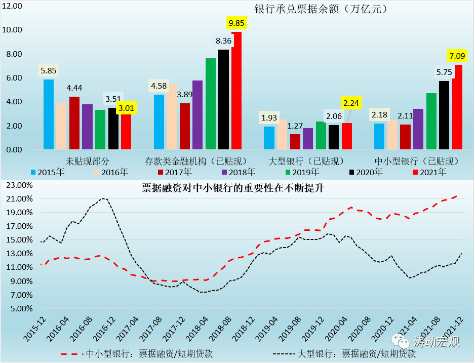 對(duì)于銀行承兌匯票數(shù)據(jù)的觀察可以從兩個(gè)指標(biāo)來(lái)看,即社融指標(biāo)的未貼現(xiàn)銀票和已貼現(xiàn)銀票,前者被視為表外融資部分(通過(guò)每月公布的社融指標(biāo)來(lái)確定),后者則通常被視為銀行的表內(nèi)業(yè)務(wù)(通過(guò)金融機(jī)構(gòu)信貸收支表來(lái)確定)。具體看,截至2021年12月底,未貼現(xiàn)銀行承兌匯票余額達(dá)到3.01萬(wàn)億,金融機(jī)構(gòu)提供的票據(jù)貼現(xiàn)融資余額為9.85萬(wàn)億(本外幣口徑)。其中,大型銀行和中小型銀行的余額分別為2.24萬(wàn)億和7.09萬(wàn)億。