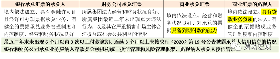 《征求意見(jiàn)稿》對(duì)銀票(含銀行和農(nóng)信社)、財(cái)務(wù)公司承兌匯票(含財(cái)務(wù)公司及所屬集團(tuán))以及商票的承兌人提出了一系列要求。其中有一條是明確的,即承兌人最近二年末未出現(xiàn)6個(gè)月以內(nèi)3次以上付款逾期、連續(xù)3個(gè)月以上未按央行(2020)第19號(hào)公告披露承兌人信用信息的情況。