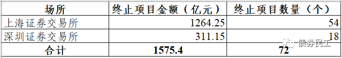 根據(jù)上海證券交易所和深圳證券交易所公司債券項目信息平臺的公開信息,2022年2月終止的債券項目(小公募、私募債和ABS)金額合計為1575.40億元,終止項目數(shù)量72個。其中上海證券交易所終止金額為1264.25億元,占比為80.25%;深圳證券交易所終止金額為311.15億元,占比為19.75%。
