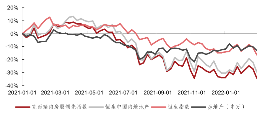 2021年1月1日以來(lái),地產(chǎn)股震蕩下行。截止2月25日,克而瑞內(nèi)房股領(lǐng)先指數(shù)跌幅34.3%,同期恒生中國(guó)內(nèi)地地產(chǎn)指數(shù)跌幅29.6%。恒生指數(shù)跌幅16.4%,房地產(chǎn)(申萬(wàn))板塊跌幅13.1%。