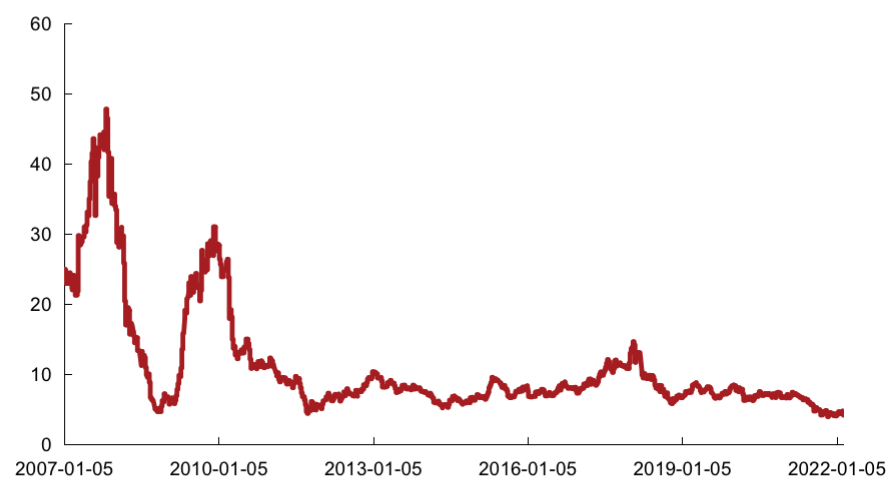 2022年2月相對(duì)恒指成分股的PE周均值為-64.4%,微低于上月相對(duì)PE周均值-64.3%,低于2021年全年相對(duì)PE周均值-61.0%。克而瑞內(nèi)房股領(lǐng)先指數(shù)成分股整體PE 2022年2月周均值為4.58,高于上月周均值4.50,低于2021年全年周均值5.75。