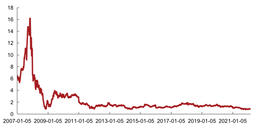 圖:克而瑞內(nèi)房股領(lǐng)先指數(shù)PB估值走勢(shì)維持低位
