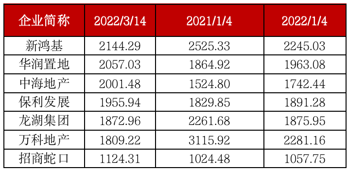 表:88家樣本企業(yè)中千億市值房企最新市值與2021、2022初對(duì)比(單位:億元)