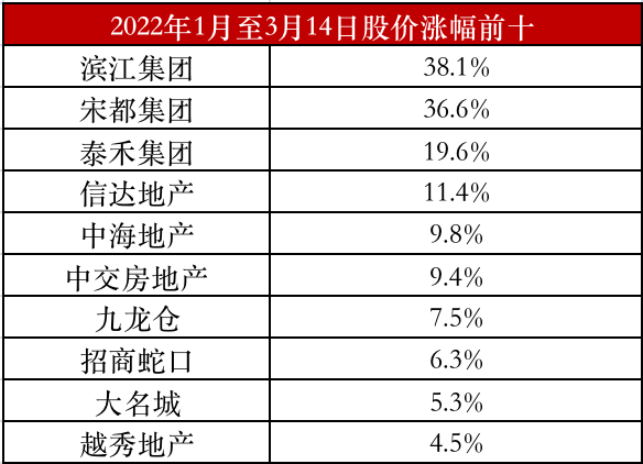 表:88家樣本房企2022年1月1日至今股價(jià)漲幅情況