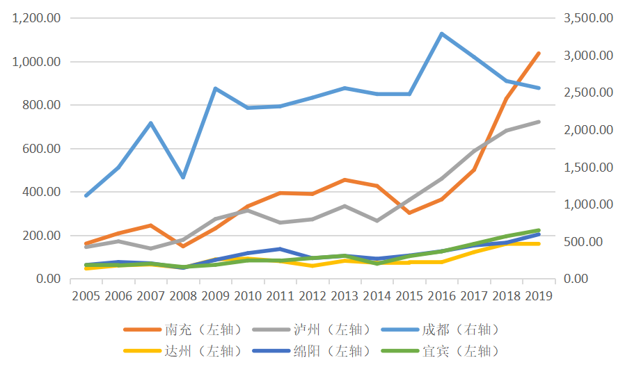 圖4.2005-2019年四川省典型區(qū)域商品房銷售面積(單位:萬平方米)
