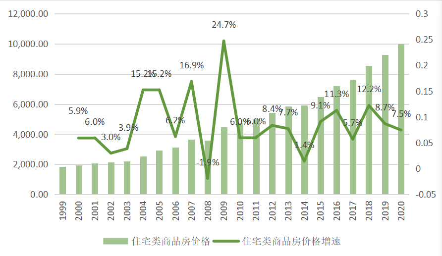2.“預(yù)期紅利”。債務(wù)導(dǎo)致的流動性過剩(見《隱性債務(wù)與貨幣供給》一文)背景下,投機性需求一直蠢蠢欲動。房價增速在2014年短暫地趨近于0之后(如圖3),又開始以較高增速增長,2015-2020年均增速都在5.7%以上,完美跑贏CPI。再堅定的房價“不漲論者”都被現(xiàn)實打臉,不禁懷疑自己對世界的認(rèn)知是不是有偏差,再堅定的“佛系者”都不免想跳墻,覺得是否有必要保持佛系而不是去投一把資或者投一把機。我們不能說買N套房才是投資或投機,經(jīng)濟學(xué)注重邊際分析,以前買30平米滿足需求,在生命周期內(nèi)平衡好了吃穿住行等支出用度,現(xiàn)在預(yù)期改變,買到31平米,那多出的1平米就是廣義的投資或投機。投資或投機不是貶義詞,持幣、儲蓄或持有其他類型資產(chǎn)都是資產(chǎn)配置上的選擇而已。