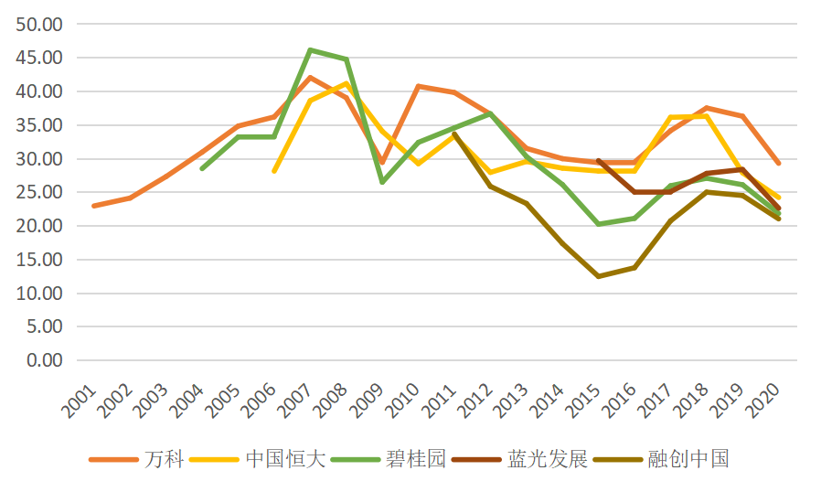 圖5.2001-2020年典型開發(fā)商銷售毛利率(單位:%)