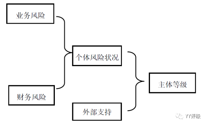 基于以上各家對城投行業(yè)信用風險特征的分析,各家評級公司制定了相應的評級方法邏輯框架。從邏輯框架來看,大部分評級公司采用了分析業(yè)務(或稱為“經(jīng)營”)、財務兩個模塊的風險得出個體信用等級,再通過分析外部支持最終得出主體信用級別的方式,如下圖:
