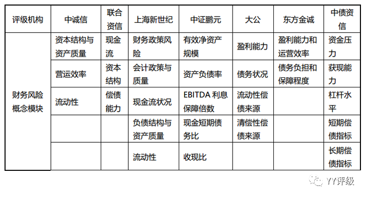 但是中誠信和大公國際以及中債資信的評級邏輯框架在此基礎上有所演化,其中中誠信在業(yè)務風險和財務風險外,將治理與管控單獨放在一個模塊中,主要從治理水平和管控能力兩個方面衡量。大公國際是將業(yè)務風險和財務風險重新調(diào)整為償債環(huán)境、財富創(chuàng)造能力、償債來源與負債平衡三個模塊。中債資信則是氛圍資源配置和債務政策兩個模塊。但是其實質(zhì)僅是業(yè)務風險和財務風險中的內(nèi)容重新分配的相應的個性化模塊中。